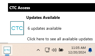 As seen in the above section, when you right-click on the CTC Access icon in the System Tray, a popup menu will appear. To manually check for updates to CTC applications, select the “Check for updates now” option. In order to check for updates, you must both have an Internet connection and be signed in to the CTC ecosystem.