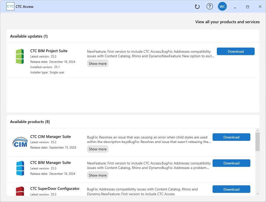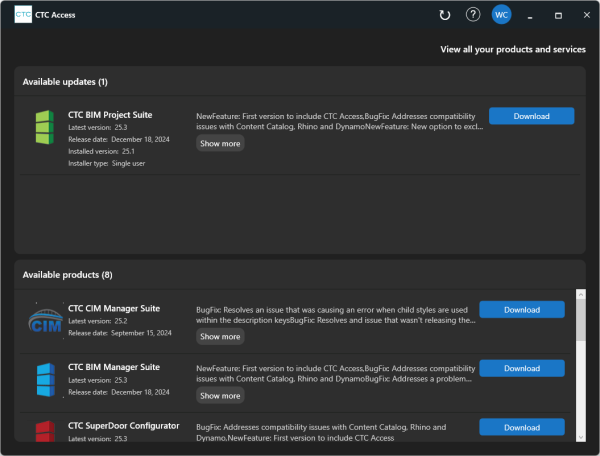 The CTC Access application is similar to the Autodesk Access application. Its main purpose is to alert you when new versions of applications from CTC Software become available, and to make it easy for you to download the installers for the latest versions of CTC applications.