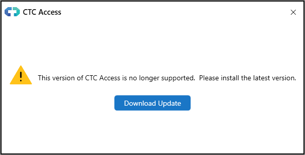 From time to time the CTC Access application itself may require updating. If a mandatory update is required, this dialog will be displayed whenever you open the main dialog: