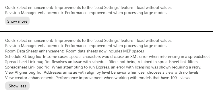 The middle section contains the release notes for the latest version available. This typically contains the information about new features, enhancements and bug fixes. The “Show more” button will display the full list of release notes. The “Show less” button will collapse the list to just the first couple of notes in order to display information about more products on the screen at once: