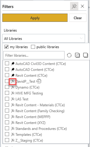 In the list of libraries on the filter panel, the “Pinned” feature can be set to show often searched libraries at the top of the list. Simply click the pin icon before the name to set it to the top.