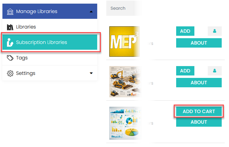 In the portal, go to CMS –> Subscription Libraries to browse the list of available providers. Once decided on the library to purchase, choose 'ADD TO CART'